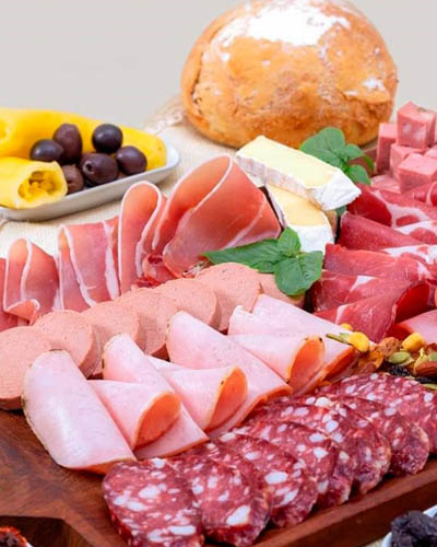 Chorizos, longaniza, salchichón, lomos, fuet, jamones cocidos naturales, ahumados, mortadelas, chóped, etc.